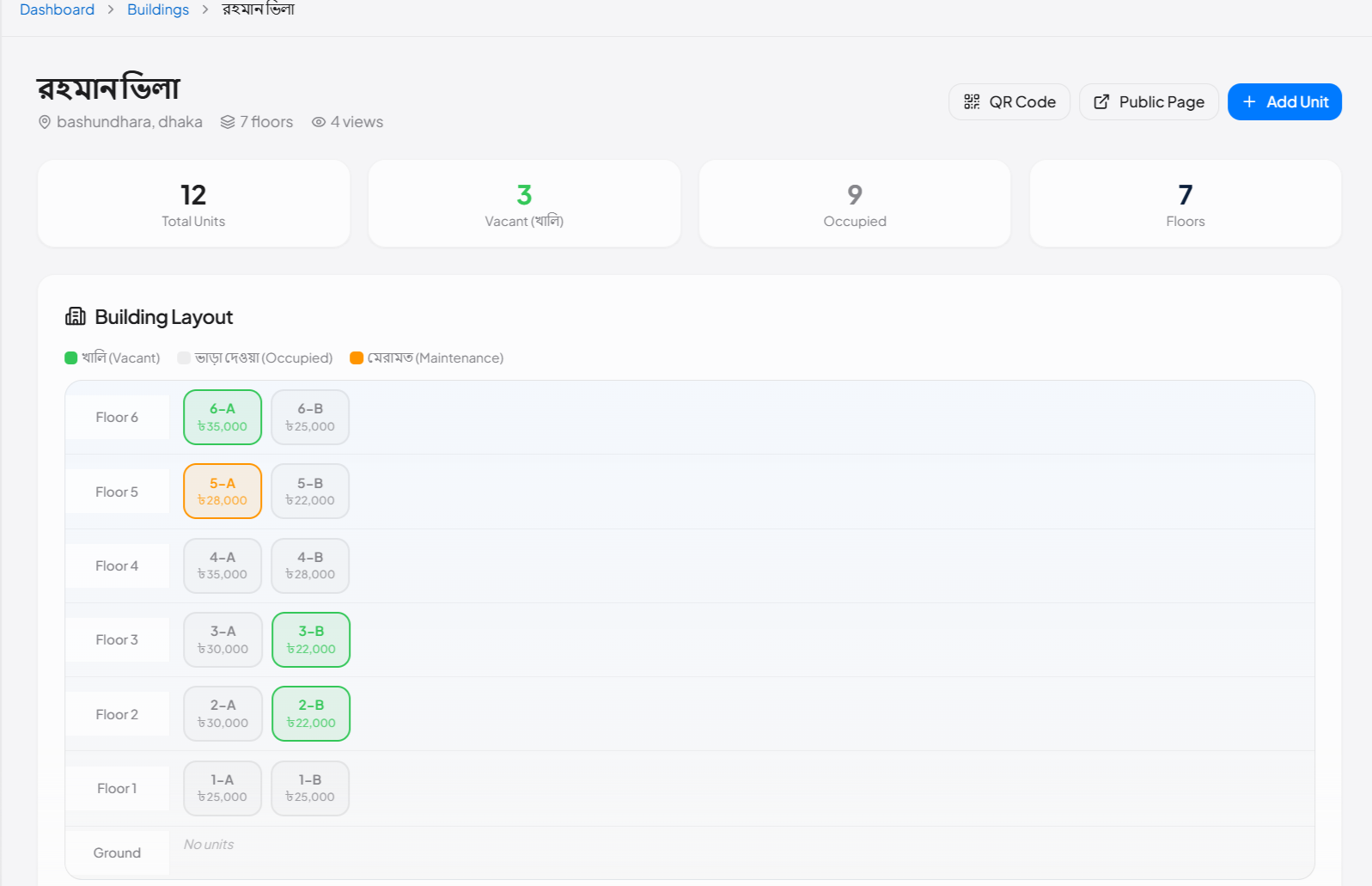 - ইন্টারেক্টিভ ফ্লোর ভিউ — সবুজ = খালি, ধূসর = ভাড়া দেওয়া