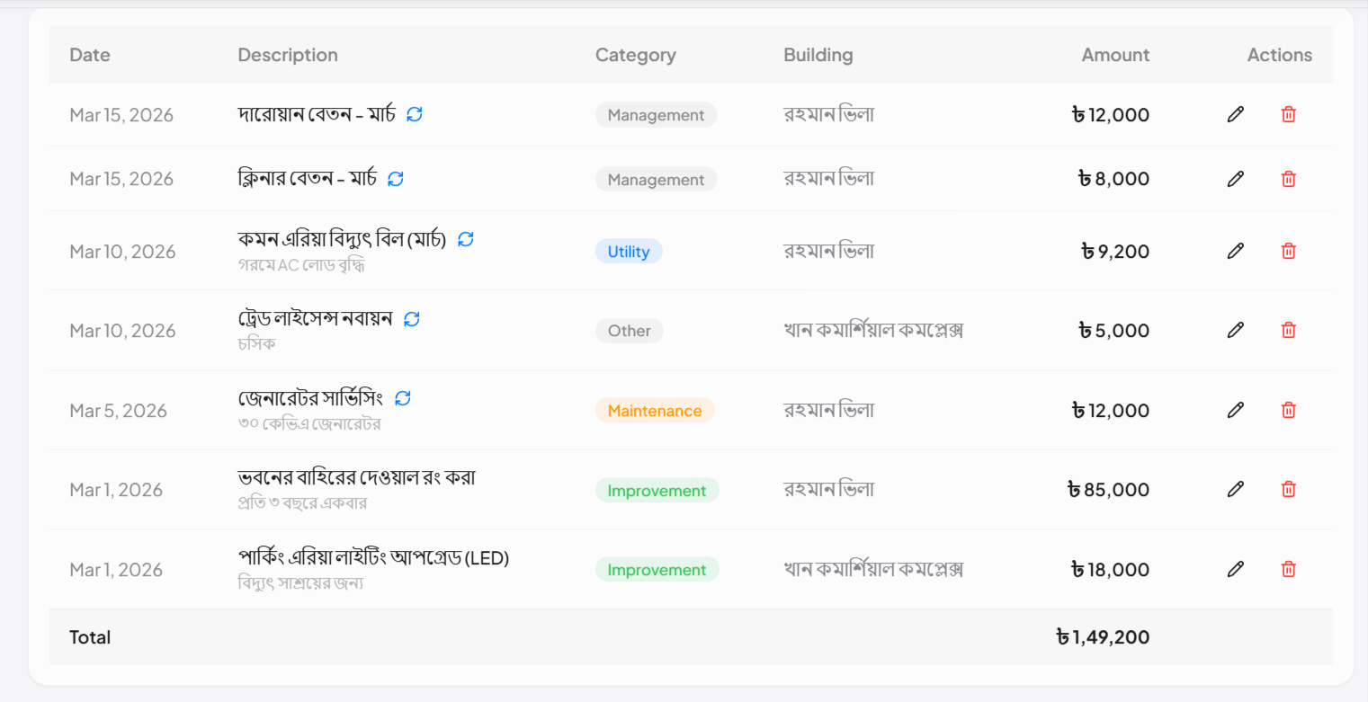 - বিল্ডিং-ওয়াইজ খরচের রেকর্ড