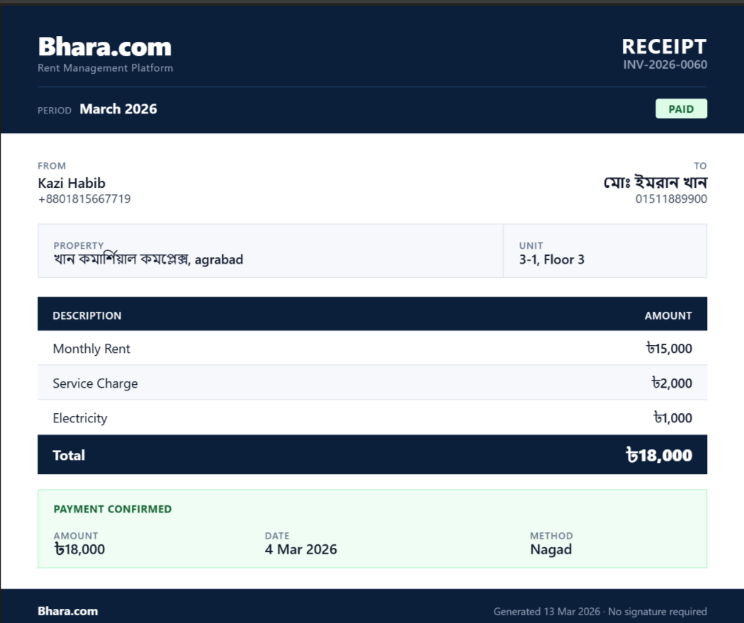 - পেমেন্ট হলে ডিজিটাল রসিদ — PDF ডাউনলোড